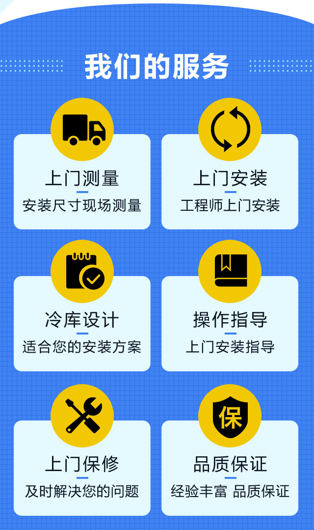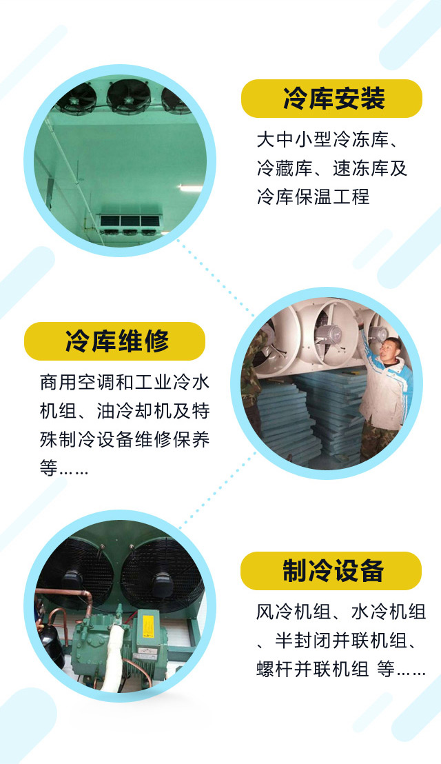 我公司的安装项目包括:大中小型冷冻库、冷藏库、速冻库及冷库保温工程,其配套产品有:风冷机组、水冷机组、半封闭并联机组、螺杆并联机组、节能铝排、吊顶式冷风机、速冻搁架等,应用于果蔬食品冷藏保鲜、禽肉速冻冷冻、水产品冷冻冷藏、食品加工及生物制药等。